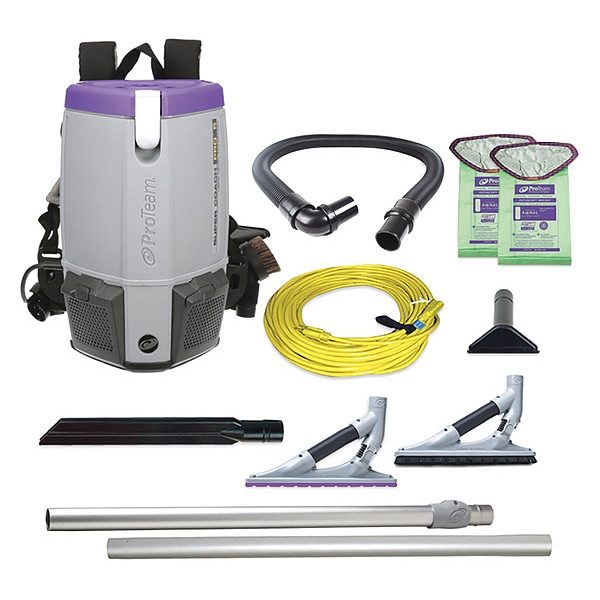 Backpack Vacuum, Vacuum Power Source Corded, Vacuum Filtration Type Standard, Vacuum Collection Type Bag, Vacuum Capacity 1 1/2 gal, Vacuum Pickup Type Dry, Vacuum Air Flow 159 cfm, Static Pressure 96 in, Weight 11.6 lb, Height 18 in, Sound Level 70 dB, Number of Motor Stages 1, Power 1,108 W, Current 9.5 A, Frequency 60 Hz, Voltage 120V AC, Hose Dia. 1 1/2 in, Hose Length 4 ft, Power Cord Length 50 ft, Series Super Coach Pro 6