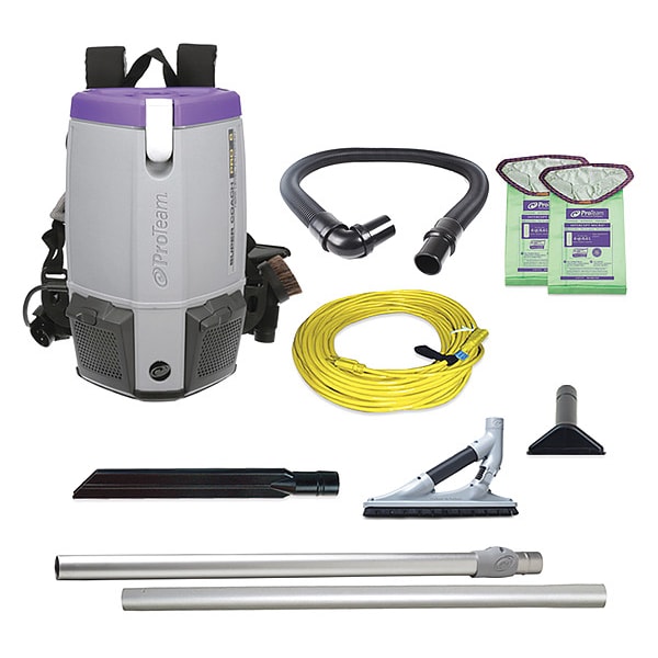 Backpack Vacuum, Vacuum Power Source Corded, Vacuum Filtration Type Standard, Vacuum Collection Type Bag, Vacuum Capacity 1 1/2 gal, Vacuum Pickup Type Dry, Vacuum Air Flow 153 cfm, Static Pressure 96 in, Weight 11.6 lb, Height 18 in, Sound Level 70 dB, Number of Motor Stages 1, Power 1,108 W, Current 9.5 A, Frequency 60 Hz, Voltage 120V AC, Hose Dia. 1 1/2 in, Hose Length 4 ft, Power Cord Length 50 ft, Series Super Coach Pro 6