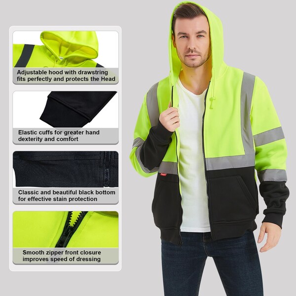 - ENHANCED SAFETY FEATURES: Complying with ANSI Class 3 standards, this hooded sweatshirt comes with 2-inch-wide silver reflective tapes expertly stitched around the upper body, waist, arms, front, and back, offering full 360 degree visibility to enhance safety significantly. These reflective elements guarantee outstanding visibility, even in low-light conditions, reinforcing your safety during your work activities