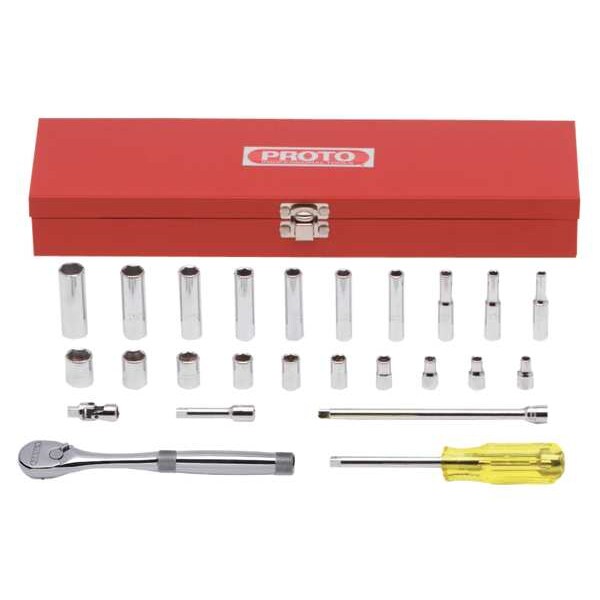 Socket Wrench Set, Standard Socket Count/Style (10) 6-Point, Standard Socket Style/Size Standard 6-Point: 3/16 in, 7/32 in, 1/4 in, 9/32 in, 5/16 in, 11/32 in, 3/8 in, 7/16 in, 1/2 in, 9/16 in, Deep Socket Count/Style (10) 6-Point, Deep Socket Style/Size Deep 6-Point: 3/16 in, 7/32 in, 1/4 in, 9/32 in, 5/16 in, 11/32 in, 3/8 in, 7/16 in, 1/2 in, 9/16 in, Flex Socket Count/Style None, Drive Size 1/4 in, Drive Type Hand, Chrome, Impact Rated No