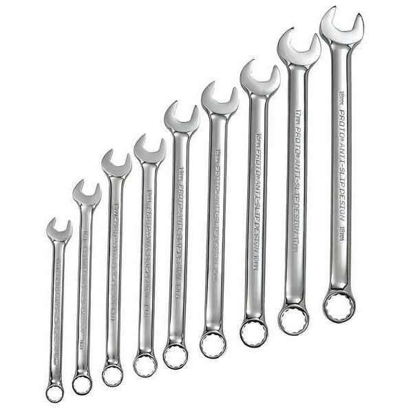 Combination Wrench Set, Alloy Steel, Chrome, Number of Tools 9, Range of Head Sizes 10 mm to 18 mm, Head Offset Angle 15 Degrees , Offset, Tool Roll, Metric, 10 mm, 11 mm, 12 mm, 13 mm, 14 mm, 15 mm, 16 mm, 17 mm, 18 mm, Rounded, Opening Angle (Deg.) 15 Degrees
