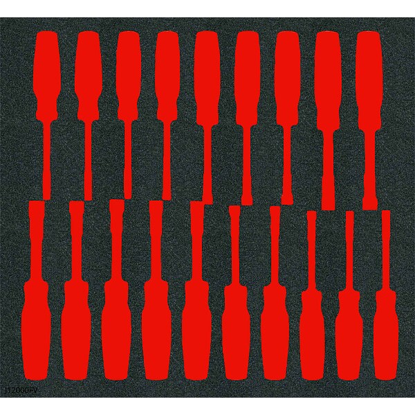 Foam Insert, Color Black, Red, Compatible with Grainger Part Number Not Applicable, Compatible with Manufacturer Model No. J12000S, Compatible with Product Type Tool Boxes, Customizable Not Customizable, Features Flexible, For Use With Tool Set, Includes Not Applicable, Material Polyethylene Foam, Number of Compartments 19, Overall Height 1 1/4 in, Overall Length 16 in, Overall Width 23 in, Series Not Applicable