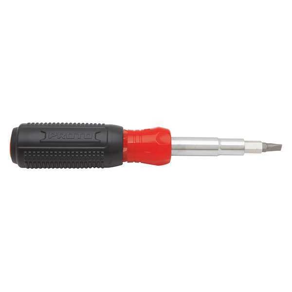 Integrated screwdriver/nut driver shaft holds 4 bits and converts to 3 nut driver size