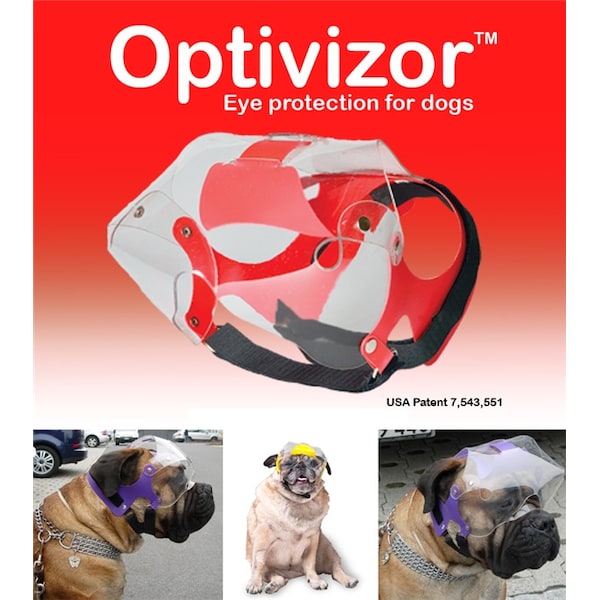 This version of the Optivizor is for Pugs and other short snouted dogs. Made from clear soft PVC to aid in visibility. A head rest is incorporated which cushions and allows space between the inner surface of the vizor and the animals face, allowing for greater air flow and comfort.