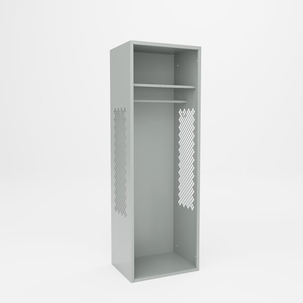 All welded steel, Heavy Duty Open Security Gear Locker. Perforated sides for ventilation. Includes full width coat rod, 2 coat hooks. 24in W x 18in D x 72in H. Powder Coat finish.
