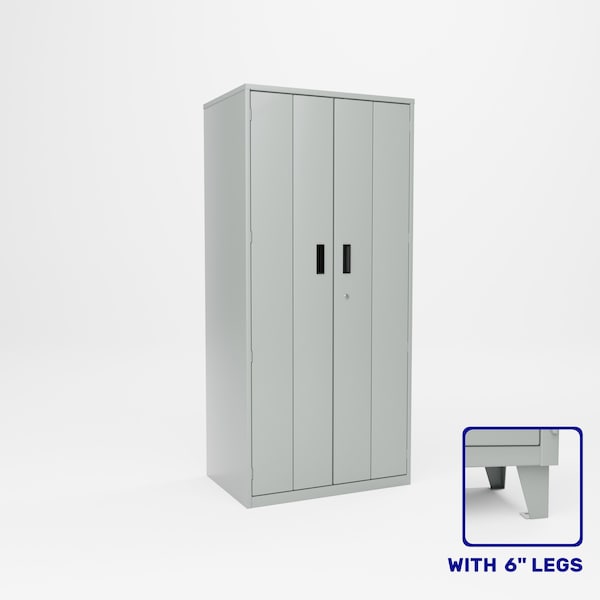 All welded steel, heavy duty Bi-fold storage cabinet with plastic storage bins. Cabinet projects only 9in when open. 36in Wide x 84in High x 24in Deep. 1 fixed shelf. Includes 16 ea. bins size 14in x 8in x 7in and 8 ea. bins size 14in x 16in x 7in. 3 point lock. Cylin Der lock with 2 keys. With 6in H Legs. Powder Coat finish. GRAY..