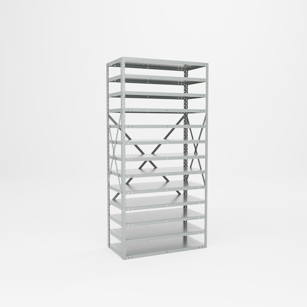 All steel, Heavy Duty Knock Down Shelf Rack. Constructed of 20 gauge steel and has a capacity of 400 lbs. per shelf. Sized perfectly to accommodate bins. Unit measures 36in W x 18in D x 73in H. Includes 13 shelves. Ships unassembled. Powder Coat finish..