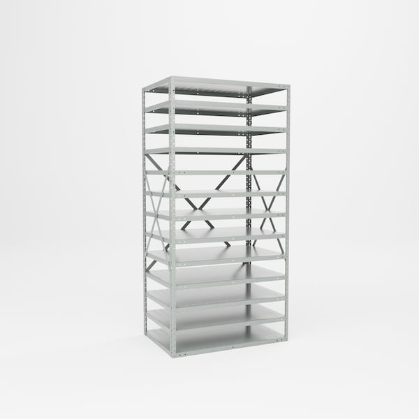 All steel, Heavy Duty Knock Down Shelf Rack. Constructed of 20 gauge steel and has a capacity of 400 lbs. per shelf. Sized perfectly to accommodate bins. Unit measures 36in W x 24in D x 73in H. Includes 13 shelves. Ships unassembled. Powder Coat finish..