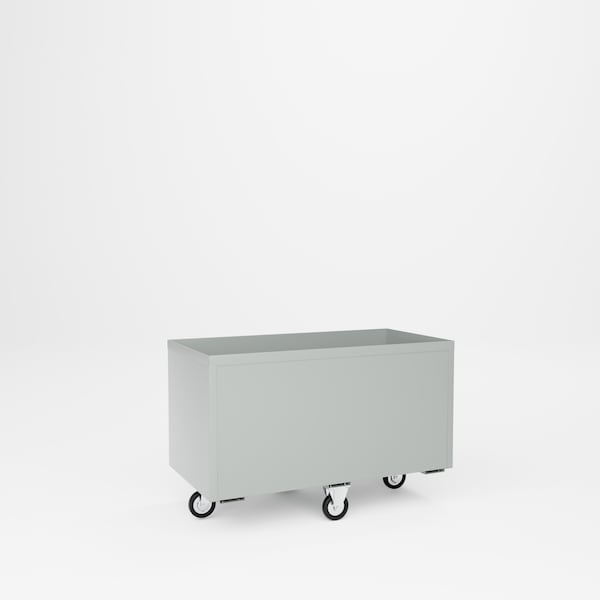 All welded steel, Heavy Duty Box Truck. Constructed of 14 gauge steel. Casters mounted in diamond pattern with 1/4in tilt. Unit is able to turn within half of its length. 2 swivel, 2 rigid 5in x 1-1/4in polyurethane casters. Capacity 1,000 lbs. Dimensions 48in W x 24in D x 30in H overall. Powder Coat finish.