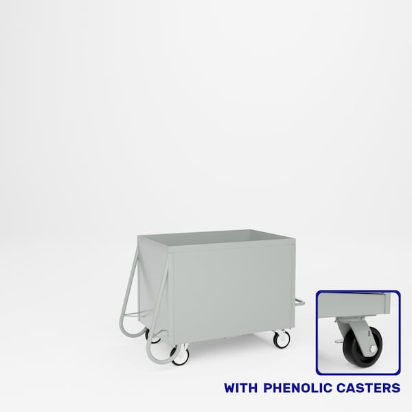 All welded steel, Heavy Duty Roll-Over Box Truck. Constructed of 14 gauge steel. Features a roll-over bar and handle to give maximum leverage when turning over load from horizontal to vertical position.2 swivel, 2 rigid 5in x 1-1/4in polyurethane casters. Capacity 1,000 lbs. Dimensions 36in W x 24in D x 30in H overall. Powder Coat finish. GRAY.