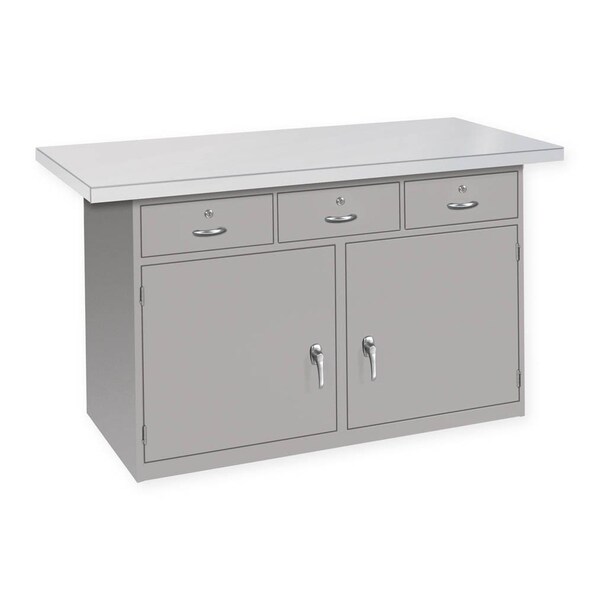 All welded steel, Heavy Duty Cabinet Drawer Bench with Laminate Wood Top. 60in W x 34in H x 30in D. Provides large working space with large storage area. Hardwood top 60in W x 30in D x 1-3/4in. 3 cylin Der locking drawers mounted side by side, 2 locking doors, and one fixed center shelf is included in doorcompartment. 2,000 lbs. capacity evenly distributed. Powder Coat finish. GRAY.