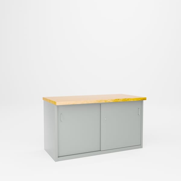 All welded steel, Heavy Duty Cabinet Workbench with Adjustable Shelf and Sliding Doors. . Shelf adjusts on 4in centers. Sliding doors equipped with a cylin Der lock.60in W x 30in D x 34in H.2,000 lbs capacity top surface / 500 lbs. shelf.Powder Coat finish. GRAY.