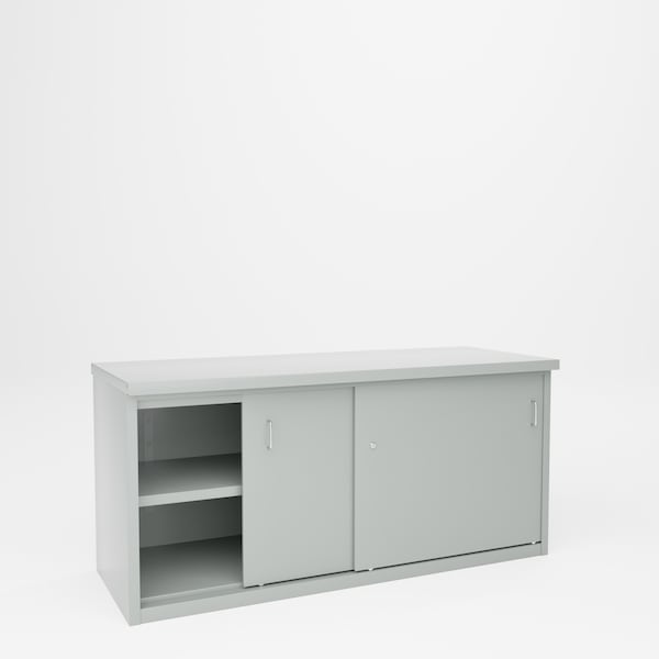 All welded steel, Heavy Duty Cabinet Workbench with Adjustable Shelf and Sliding Doors. . Shelf adjusts on 4in centers. Sliding doors equipped with a cylin Der lock.72in W x 28in D x 34in H.2,000 lbs capacity top surface / 500 lbs. shelf.Powder Coat finish. GRAY.