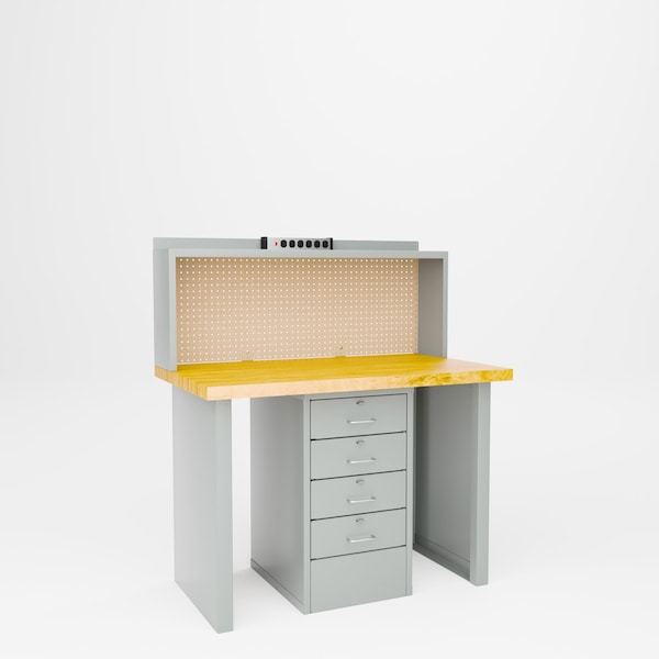 All welded steel, Heavy Duty Center Drawer Work Station with Hardwood Top. Includes riser, pegboard back, and electrical outlet strip on top. Unit includes 4 drawers with 6in H base. Drawer size 14in W x 23-1/2in D x 5in H. Top drawer includes small parts tray. Bench dimensions 48in W x 30in D x 34in H. Powder Coat finish. GRAY..
