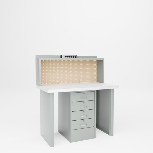 All welded steel, Heavy Duty Center Drawer Work Station with Laminate Top. Includes riser, pegboard back, and electrical outlet strip on top. Unit includes 4 drawers with 6in H base. Drawer size 14in W x 23-1/2in D x 5in H. Top drawer includes small parts tray. Bench dimensions 48in W x 30in D x 34in H. Powder Coat finish. Black..