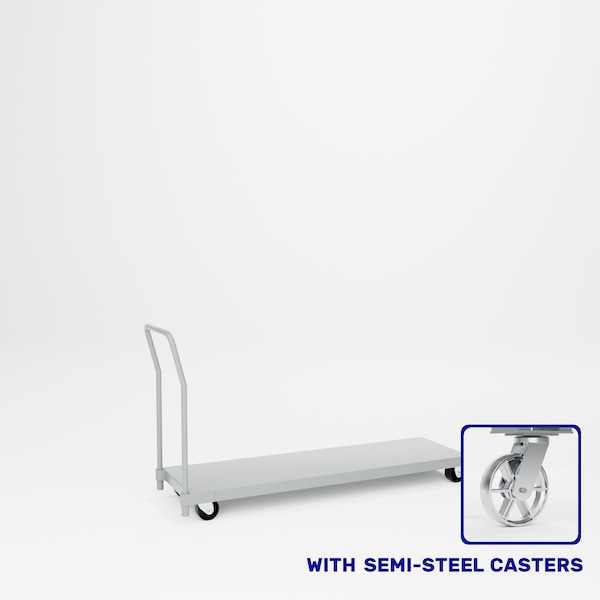 All welded steel, Heavy Duty Dolly Platform Truck. Low profile platform truck consists of a 12 gauge steel platform with a removable tubular handle.Overall height 36in. Deck is 5-3/4in from floor. 2 swivel, 2 rigid 4in x 2in semi-steel casters. Capacity 1,000 lbs. Dimensions 60in W x 18in D x 36inoverall height. Powder Coat finish.