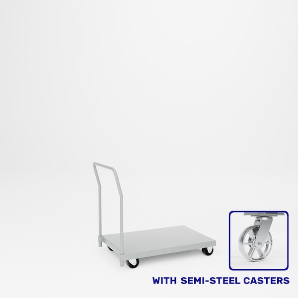 All welded steel, Heavy Duty Dolly Platform Truck. Low profile platform truck consists of a 12 gauge steel platform with a removable tubular handle.Overall height 36in. Deck is 5-3/4in from floor. 2 swivel, 2 rigid 4in x 2in semi-steel casters. Capacity 1,000 lbs. Dimensions 36in W x 24in D x 36inoverall height. Powder Coat finish.