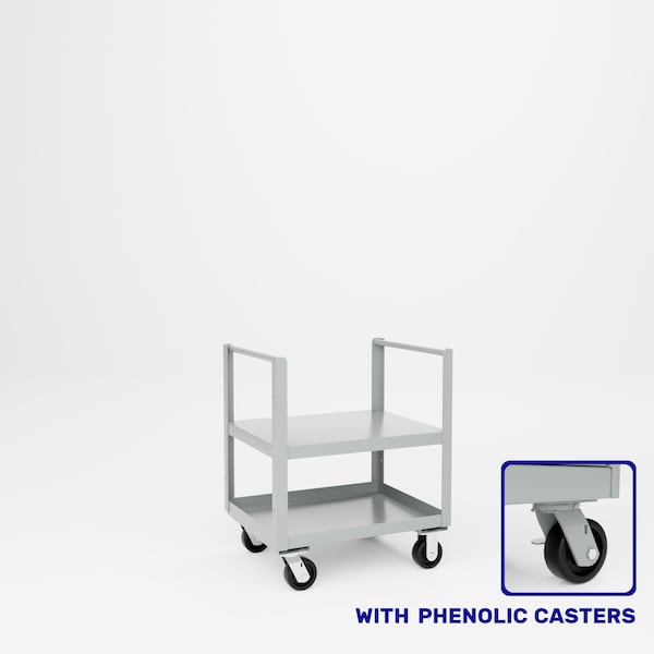 All welded steel, Heavy Duty Double Push Handle Truck. Designed for stock and general shop use. Push handle on both ends. Includes 2 shelves. Flat top shelf and tray bottom shelf. 2 rigid, 2 swivel 5in x 2in phenolic casters. Dimensions 30in W x 24in D x 36inOAH, 22in H to top shelf. Capacity 2,000 lbs. Powder Coat finish..
