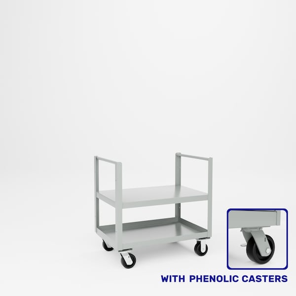 All welded steel, Heavy Duty Double Push Handle Truck. Designed for stock and general shop use. Push handle on both ends. Includes 2 shelves. Flat top shelf and tray bottom shelf. 2 rigid, 2 swivel 5in x 2in phenolic casters. Dimensions 36in W x 24in D x 36inOAH, 22in H to top shelf. Capacity 2,000 lbs. Powder Coat finish..