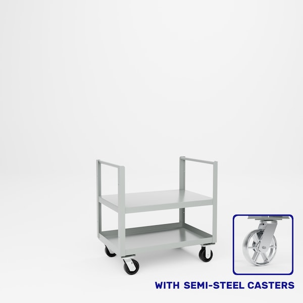 All welded steel, Heavy Duty Double Push Handle Truck. Designed for stock and general shop use. Push handle on both ends. Includes 2 shelves. Flat top shelf and tray bottom shelf. 2 rigid, 2 swivel 5in x 2in semi-steel casters. Dimensions 36in W x 24in D x 36inOAH, 22in H to top shelf. Capacity 2,000 lbs. Powder Coat finish..