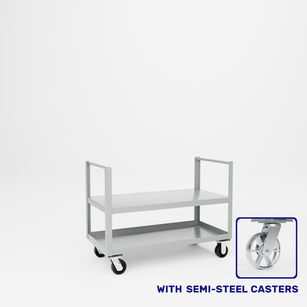 All welded steel, Heavy Duty Double Push Handle Truck. Designed for stock and general shop use. Push handle on both ends. Includes 2 shelves. Flat top shelf and tray bottom shelf. 2 rigid, 2 swivel 5in x 2in semi-steel casters. Dimensions 48in W x 24in D x 36inOAH, 22in H to top shelf. Capacity 2,000 lbs. Powder Coat finish..