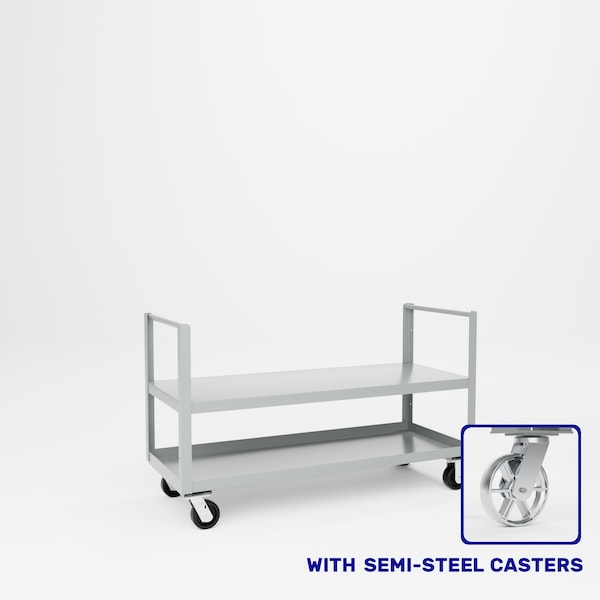 All welded steel, Heavy Duty Double Push Handle Truck. Designed for stock and general shop use. Push handle on both ends. Includes 2 shelves. Flat top shelf and tray bottom shelf. 2 rigid, 2 swivel 5in x 2in semi-steel casters. Dimensions 60in W x 24in D x 36inOAH, 22in H to top shelf. Capacity 2,000 lbs. Powder Coat finish..