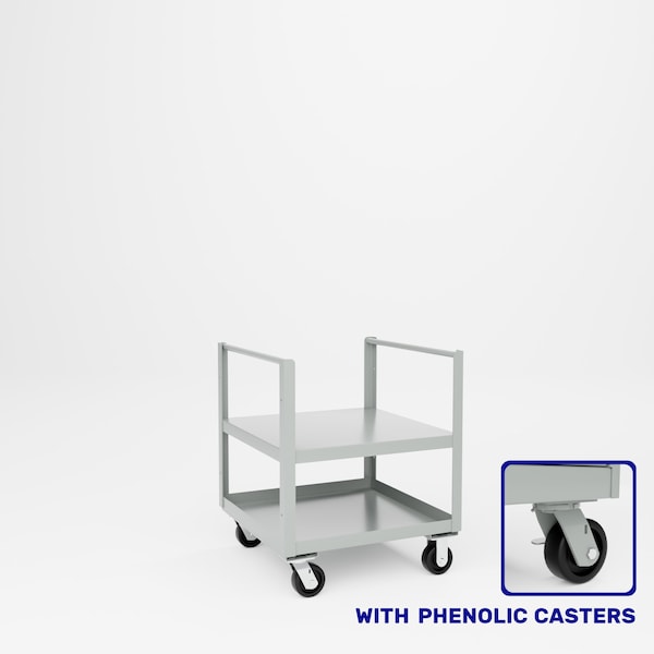 All welded steel, Heavy Duty Double Push Handle Truck. Designed for stock and general shop use. Push handle on both ends. Includes 2 shelves. Flat top shelf and tray bottom shelf. 2 rigid, 2 swivel 5in x 2in phenolic casters. Dimensions 30in W x 30in D x 36inOAH, 22in H to top shelf. Capacity 2,000 lbs. Powder Coat finish..
