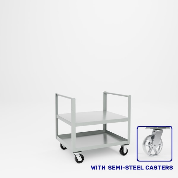 All welded steel, Heavy Duty Double Push Handle Truck. Designed for stock and general shop use. Push handle on both ends. Includes 2 shelves. Flat top shelf and tray bottom shelf. 2 rigid, 2 swivel 5in x 2in semi-steel casters. Dimensions 36in W x 30in D x 36inOAH, 22in H to top shelf. Capacity 2,000 lbs. Powder Coat finish..