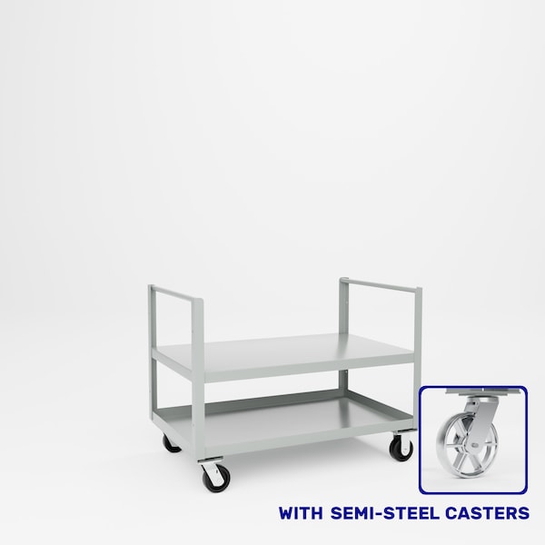 All welded steel, Heavy Duty Double Push Handle Truck. Designed for stock and general shop use. Push handle on both ends. Includes 2 shelves. Flat top shelf and tray bottom shelf. 2 rigid, 2 swivel 5in x 2in semi-steel casters. Dimensions 48in W x 30in D x 36inOAH, 22in H to top shelf. Capacity 2,000 lbs. Powder Coat finish..