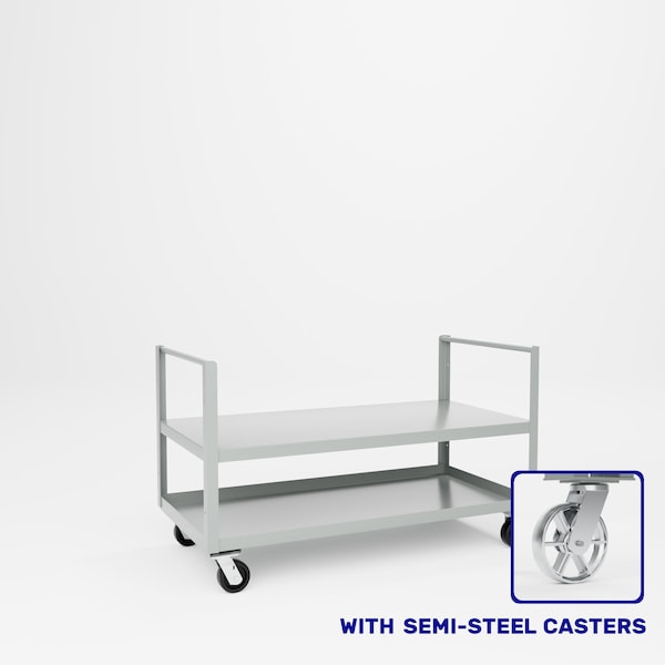 All welded steel, Heavy Duty Double Push Handle Truck. Designed for stock and general shop use. Push handle on both ends. Includes 2 shelves. Flat top shelf and tray bottom shelf. 2 rigid, 2 swivel 5in x 2in semi-steel casters. Dimensions 60in W x 30in D x 36inOAH, 22in H to top shelf. Capacity 2,000 lbs. Powder Coat finish..