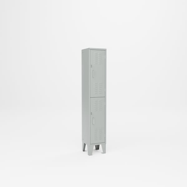 All welded steel, Heavy Duty Double Tier Locker. Fully assembled. Includes 1 two prong hook and 2 one prong coat hooks. Louvers on door for ventilation. Holes in sides for bolting multiple units together. Doors include padlock loop with chrome pull handle. Dimensions 12in W x 12in D x 60in H (overall height 66in H on 6in legs). Powder Coat finish.