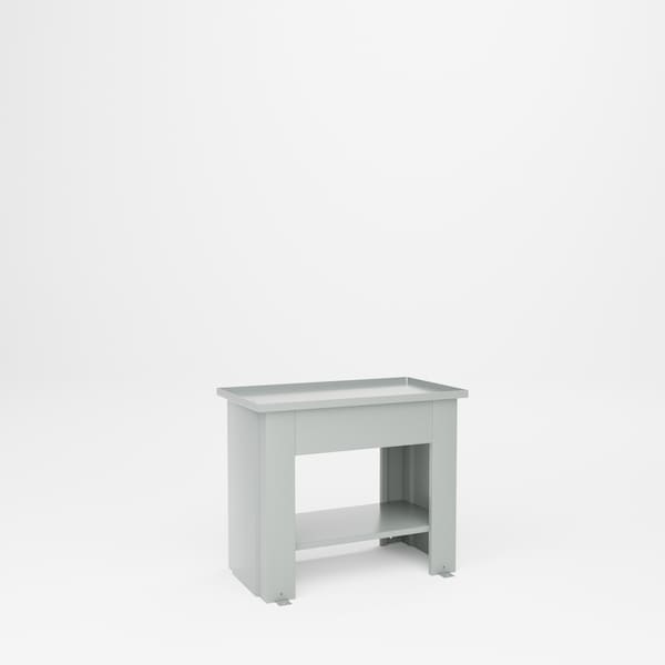 All welded steel, Heavy Duty Drain Top Door Bench. Unit has a 1-1/8in D tray top with 1/2in drain hole and 1/4in pipe connection to handle fluids, lubricants, and more. Fabricated with floor lugs to secure base to floor. Unit includes bottom shelf. 36in W x 20in D x 30in H. Capacity 3,000 lbsPowder Coat finish. GRAY.