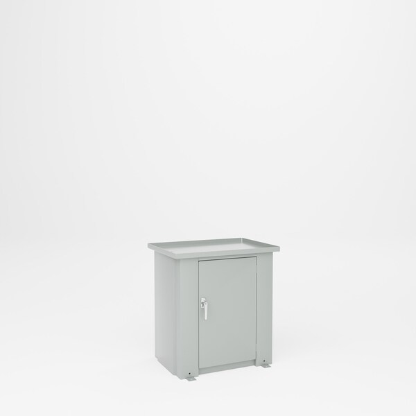 All welded steel, Heavy Duty Drain Top Door Bench. Unit has a 1-1/8in D tray top with 1/2in drain hole and 1/4in pipe connection to handle fluids, lubricants, and more. Fabricated with floor lugs to secure base to floor. Unit includes 1 door with keyed handle. 28in W x 20in D x 30in H. Capacity 3,000 lbsPowder Coat finish. GRAY.