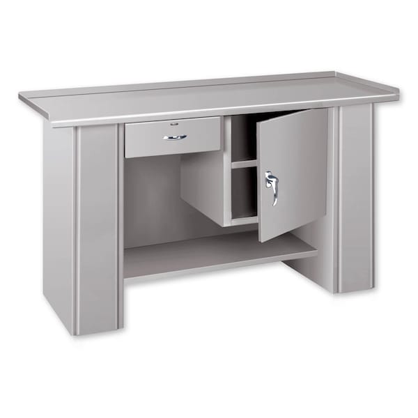 All welded steel, Heavy Duty Drop Front Tool & Repair Bench. Heavy duty construction allows for work on engines, pumps, and other repair items. Can be used for mounting lathes, grin Ders, drill presses, etc. Bench is 60in W x 22in D x 32in H. Equipped with drop front top, (1) drawer unit, and (1) CU-18 Cabinet. Drawer opens on telescoping, full extension ball bearing steel slides and includes a chrome handle, padlock loop, and small parts tray 14in W x 16in D x 5in H. Cabinet dimensions 18in W x 19in D x 19in H. Convenient shelf 36in x 15-3/4in. Capacity 3,000 lbs.Powder Coat finish. GRAY.