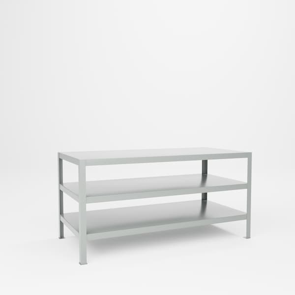 All welded steel, Extra Heavy Duty Tool Stand with 3 Shelves, for handling extremely heavy load requirements. 72in W x 34in D x 36in H. Three shelves are constructed of 12 gauge steel and are all flat. Shelf clearance is 10-5/8in H. 3/16in heavy duty steel angle is used for posts.Capacity 3,000 lbs. Powder Coat finish. GRAY.