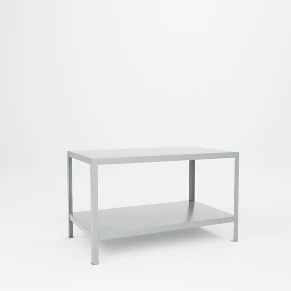 All welded steel, Extra Heavy Duty Tool Stand with 2 Shelves, for handling extremely heavy load requirements. 60in W x 34in D x 36in H. Two shelves are constructed of 12 gauge steel and are all flat. Shelf clearance is 23 1/2in H. 3/16in heavy duty steel angle is used for posts.Capacity 3,000 lbs. Powder Coat finish. GRAY.