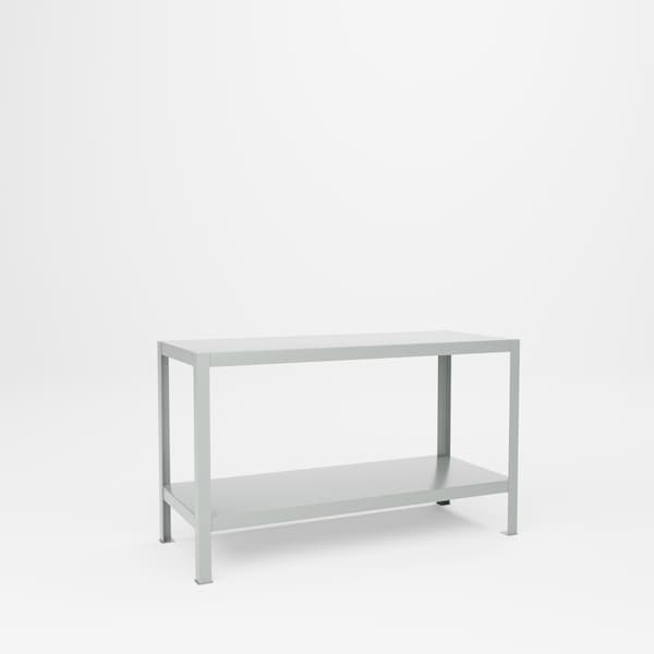 All welded steel, Extra Heavy Duty Tool Stand with 2 Shelves, for handling extremely heavy load requirements. 60in W x 24in D x 36in H. Two shelves are constructed of 12 gauge steel and are all flat. Shelf clearance is 23 1/2in H. 3/16in heavy duty steel angle is used for posts.Capacity 3,000 lbs. Powder Coat finish. GRAY.