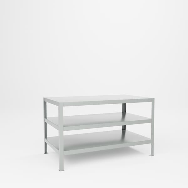 All welded steel, Extra Heavy Duty Tool Stand with 3 Shelves, for handling extremely heavy load requirements. 60in W x 34in D x 36in H. Three shelves are constructed of 12 gauge steel and are all flat. Shelf clearance is 10-5/8in H. 3/16in heavy duty steel angle is used for posts.Capacity 3,000 lbs. Powder Coat finish. GRAY.