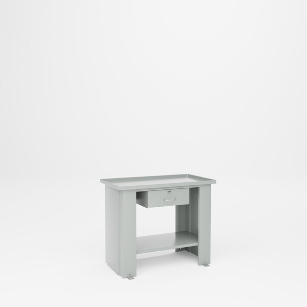 All welded steel, Heavy Duty Fluid Top Drawer Bench. Specially designed cabinets for use in "Liquid" assembly and machining. Complete with 1-1/8in tray coolant tops with 1/2in pipe connection. Floor lugs to secure base to floor. Comes with 1 drawer14in W x 16in D x 5in H. Drawer equipped with full extension ball bearing steel slidesand a small parts tray. Capacity 3,000 lbs.36in W x 20in D x 30in H. Powder Coat finish. GRAY.