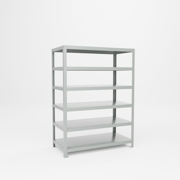 All welded steel, Extra Heavy Duty Rack with 6 Shelves. Constructed of 10 gauge posts and six-12 gauge shelves. Used for the heaviest tools, dies, and heavy material. Can be used in Dividually or bolted together in rows. No assembly required, ready to use. Foot pads on posts to protect floor. 10in shelf clearance. Capacity 1,000 lbs. per shelf. Dimensions 48in W x 24in D x 65in H. Powder Coat finish.