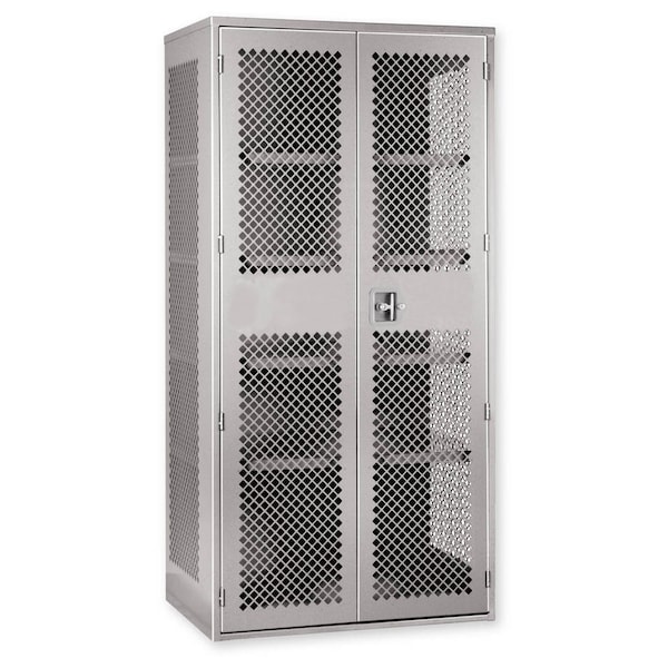 All welded steel, heavy duty storage cabinet with Perforated sides & doors. 48in Wide x 48in High x 24in Deep. 2 adjustable shelves.3 point lock. Recessed T-handle with cylin Der lock. 1,500 lbs.capacity per shelf. Powder Coat finish. GRAY..