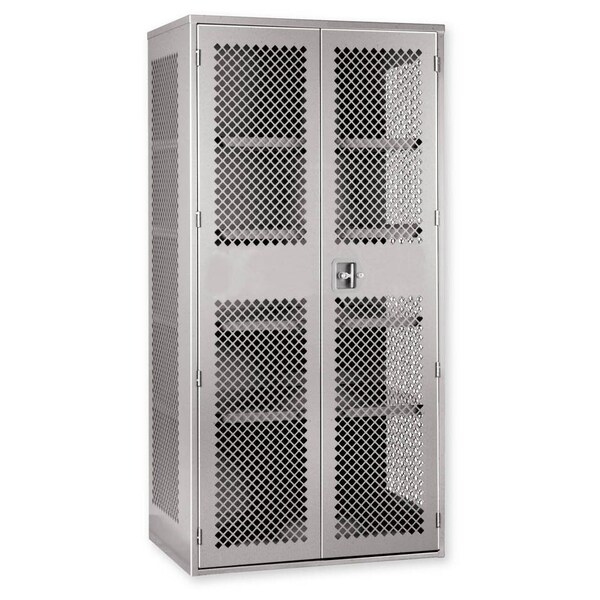 All welded steel, heavy duty storage cabinet with Perforated sides & doors. 48in Wide x 66in High x 19in Deep. 3 adjustable shelves.3 point lock. Recessed T-handle with cylin Der lock. 1,500 lbs.capacity per shelf. Powder Coat finish. GRAY. With 5in Phenolic Casters (NOTE: Casters ship loose. Hardware included).