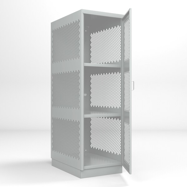 All welded steel, Heavy Duty Perforated Bulk Storage Locker with One Door and Three Compartments on 4in Base. Sides and Doors are perforated to allow for airflow. Constructed of 14 gauge steel. Door equipped with chrome pull handle and padlock loop. Compartment size 23-1/2in W x 36in D x 22-1/2in H. Capacity 1,000 lbs. per shelf. Dimensions 24in W x 36in D x 78in H. Powder Coat finish.