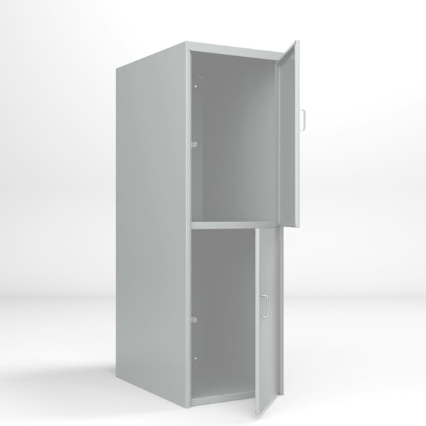 All welded steel, Heavy Duty Bulk Storage Locker with Two Doors and Two Compartments. Constructed of 14 gauge steel. Doors equipped with chrome pull handle and padlock loop. Compartment size 23-1/2in W x 36in D x 34-1/2in H. Capacity 1,000 lbs. per shelf. Dimensions 24in W x 36in D x 74in H. Powder Coat finish.
