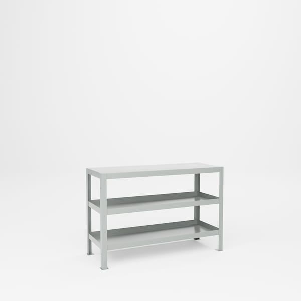 All welded steel, Heavy Duty Tool Stand with 3 Shelves, handles large loads, machinery and assembly. 18in D x 48in W x 32-1/2in H. 3 Shelf. Top shelf is flat and center/bottom is 2in tray type shelves. Shelves are 12 gauge steel, clearance is 10-1/8in between shelves. Capacity 2,000 lbs.Powder Coat finish. GRAY.
