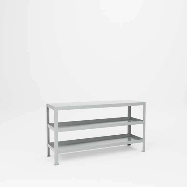 All welded steel, Heavy Duty Tool Stand with 3 Shelves, handles large loads, machinery and assembly. 18in D x 60in W x 32-1/2in H. 3 Shelf. Top shelf is flat and center/bottom is 2in tray type shelves. Shelves are 12 gauge steel, clearance is 10-1/8in between shelves. Capacity 2,000 lbs.Powder Coat finish. GRAY.