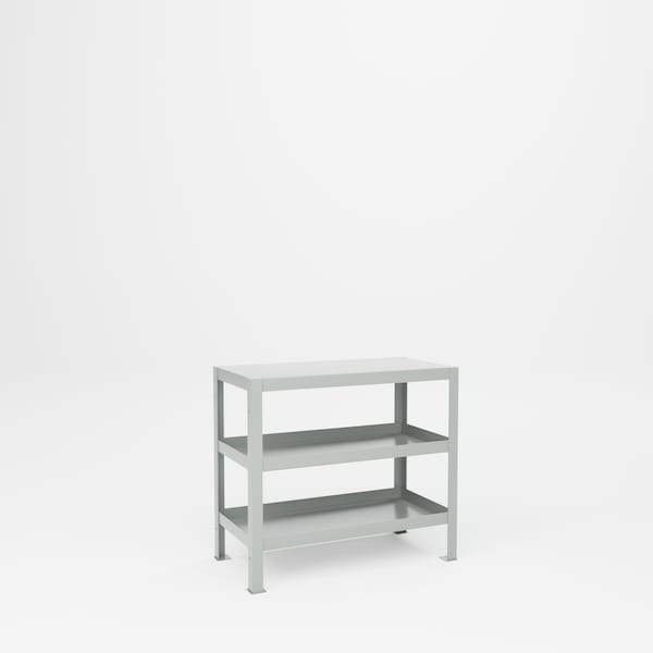 All welded steel, Heavy Duty Tool Stand with 3 Shelves, handles large loads, machinery and assembly. 18in D x 36in W x 32-1/2in H. 3 Shelf. Top shelf is flat and center/bottom is 2in tray type shelves. Shelves are 12 gauge steel, clearance is 10-1/8in between shelves. Capacity 2,000 lbs.Powder Coat finish. GRAY.