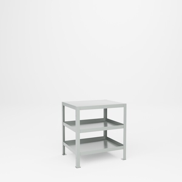 All welded steel, Heavy Duty Tool Stand with 3 Shelves, handles large loads, machinery and assembly. 24in D x 30in W x 32-1/2in H. 3 Shelf. Top shelf is flat and center/bottom is 2in tray type shelves. Shelves are 12 gauge steel, clearance is 10-1/8in between shelves. Capacity 2,000 lbs.Powder Coat finish. GRAY.