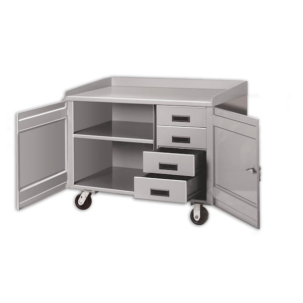 All welded steel, Heavy Duty Cabinet Workbenches feature Side and Back Stops and are complete with a keyed handle door and push handle. Work area is 48in W x 26in D X 34in H. With 4 recessed pull handle drawers and a center shelf. 2 rigid & 2 swivel 5in x 2in Phenolic casters. Capacity 2,000 lbs. Powder Coat finish. GRAY.