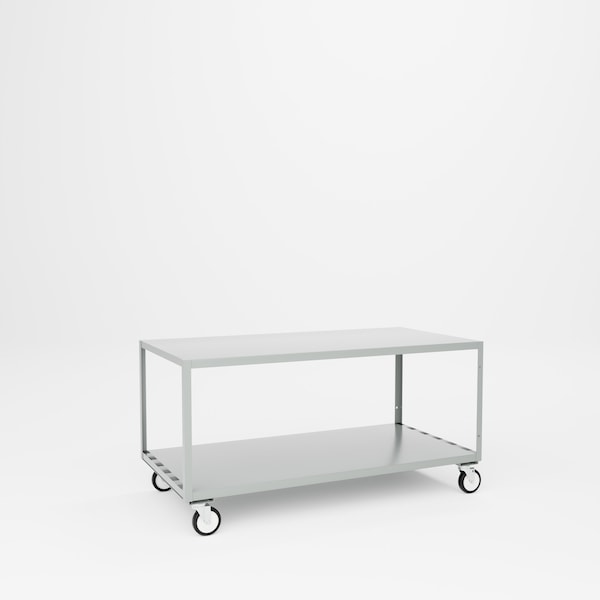All welded steel, Heavy Duty Mobile Table with 2 Shelves. Designed for shop use, yet attractive enough for office or a store. 60in W x 30in D x 30in H. Reinforced 16 gauge shelves. Shelf clearance 21in. All swivel 5in x 1-1/4in Polyurethane casters. Capacity 1,000 lbs. evenly distributed.Powder Coat finish. GRAY.